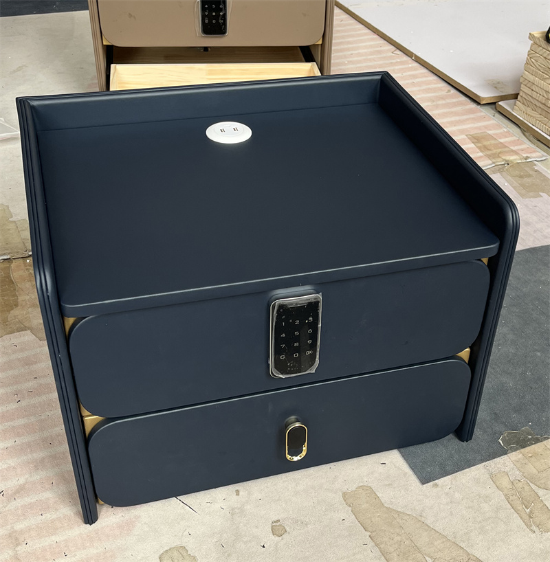 2-drawer smart nightstand with fingerprint lock, 15W wireless charger, USB/Type-C, and Bluetooth speaker. Upholstered MDF body with 3C tempered glass top. 50x40x50cm. Perfect for bedrooms and hotels. 2-year warranty. Ships from US/EU/CN.